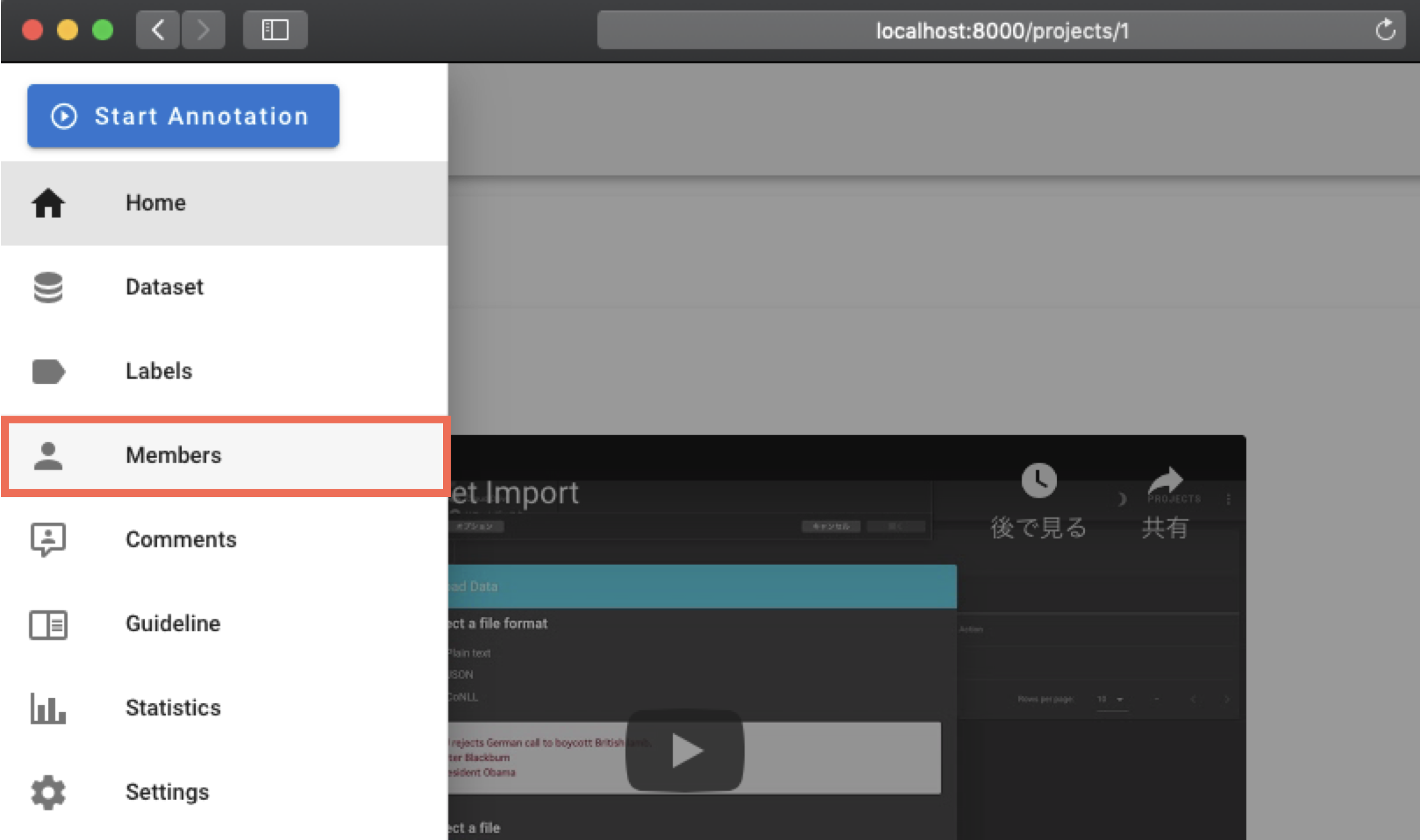 After logging in to doccano, select your project. Note that you must be the administrator of the project to add users to the project.