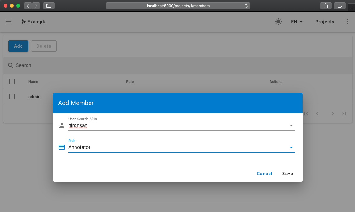 button to display the form. Fill in this form with the user name and role you want to add to the project. Then, select the Save